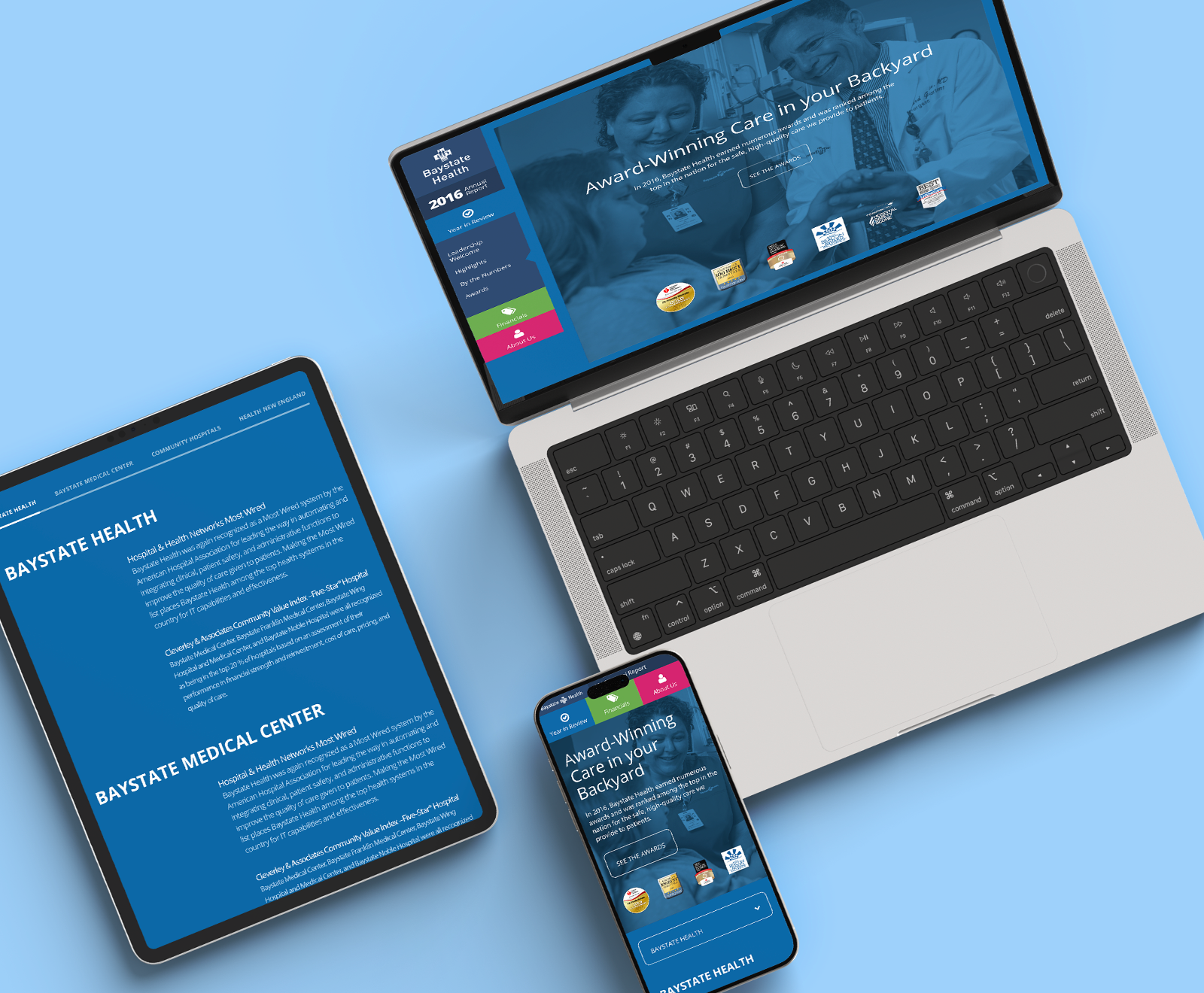 For the 2016 annual report, work focused on designing two specific pages—one detailing the hospital network’s recognitions and another that displayed key datapoints about Baystate Health. To create interactive, eye-catching designs that communicated Baystate Health’s impressive honors and impact, I employed several techniques: