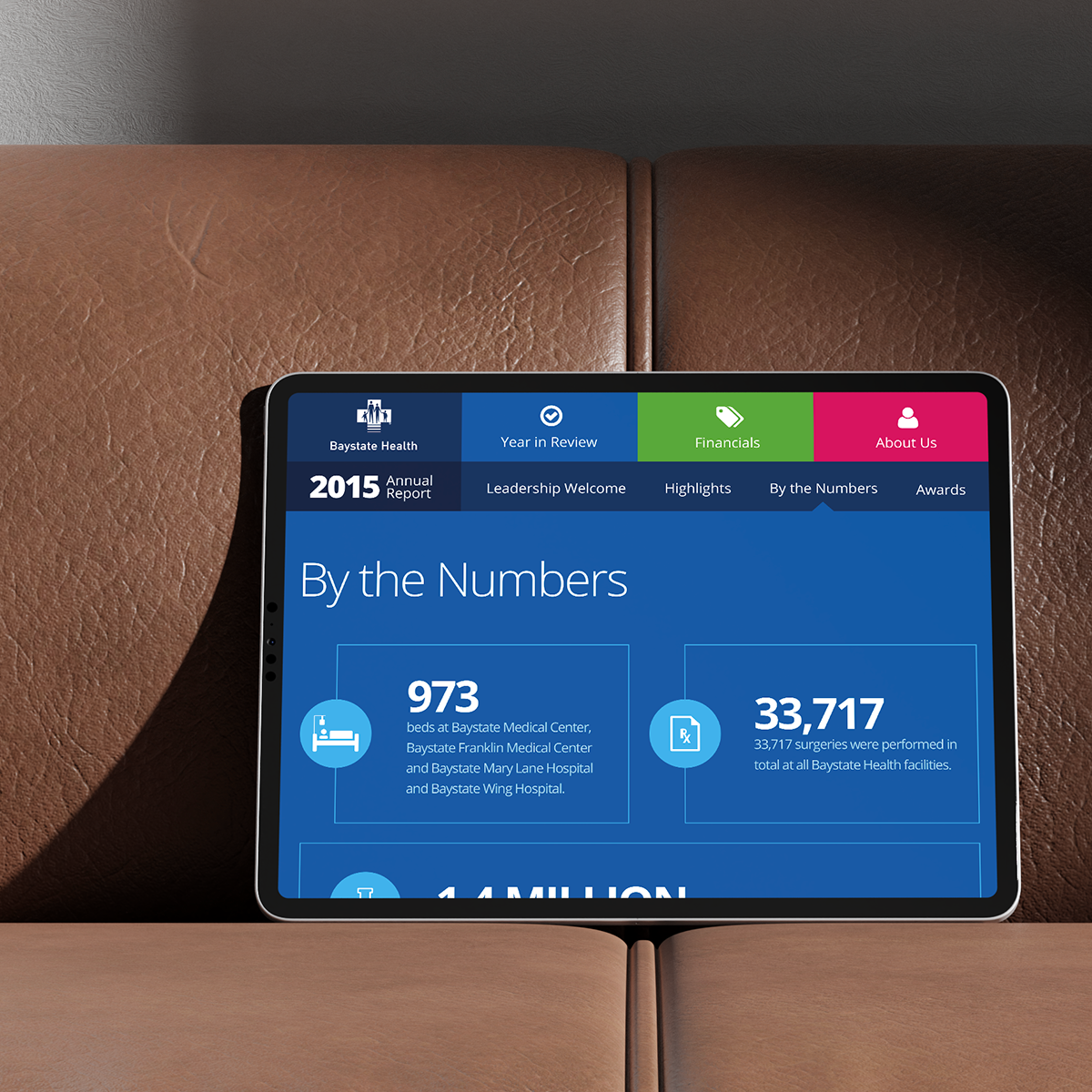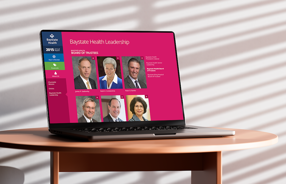 Prior to my time at Gravity Switch, Ron and his team at Baystate Health worked with the agency to realize his goal of creating a digital platform to showcase the information from Baystate Health’s annual report in a scalable, interactive, and accessible way. The result was a transition away from the traditional printed annual reports that had been produced previously, which in turn led to a significant reduction in the amount of money being spent creating the reports. I was tasked with continuing this successful partnership, providing a range of design work that included slight modifications to preexisting templates for some years while providing major redesigns for others.