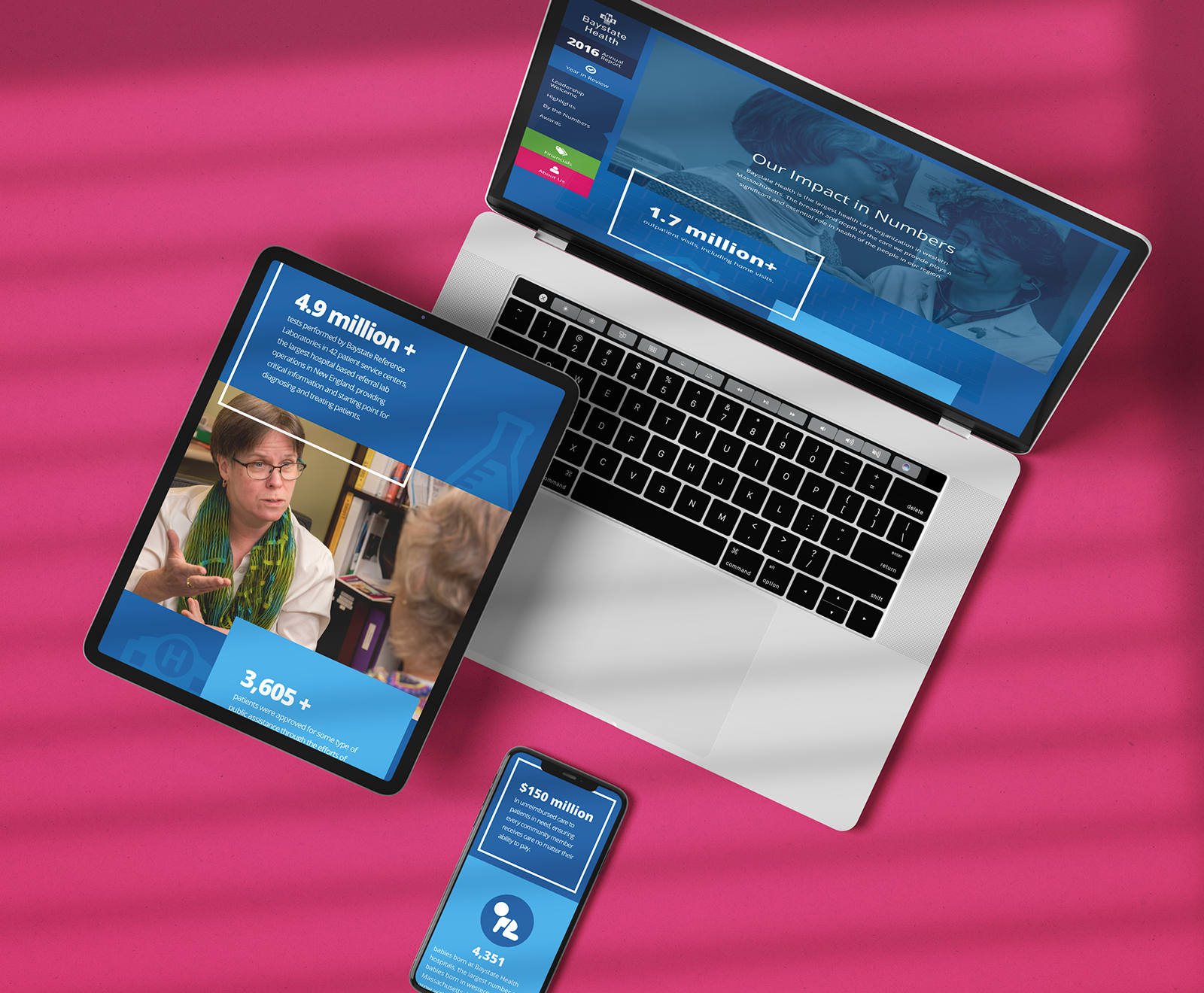 In my first year at Gravity Switch, only modest changes were called for to the annual report’s design. In 2015 however, Ron wanted to integrate the new branding that had recently been done for Baystate Health to create a fresh look and feel for the annual report’s site. I used the following approaches to create a dynamic, engaging design that reinforced the hospital’s impact on the community: