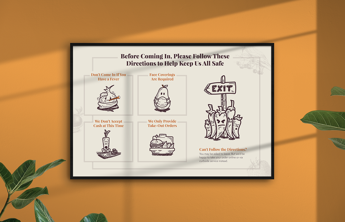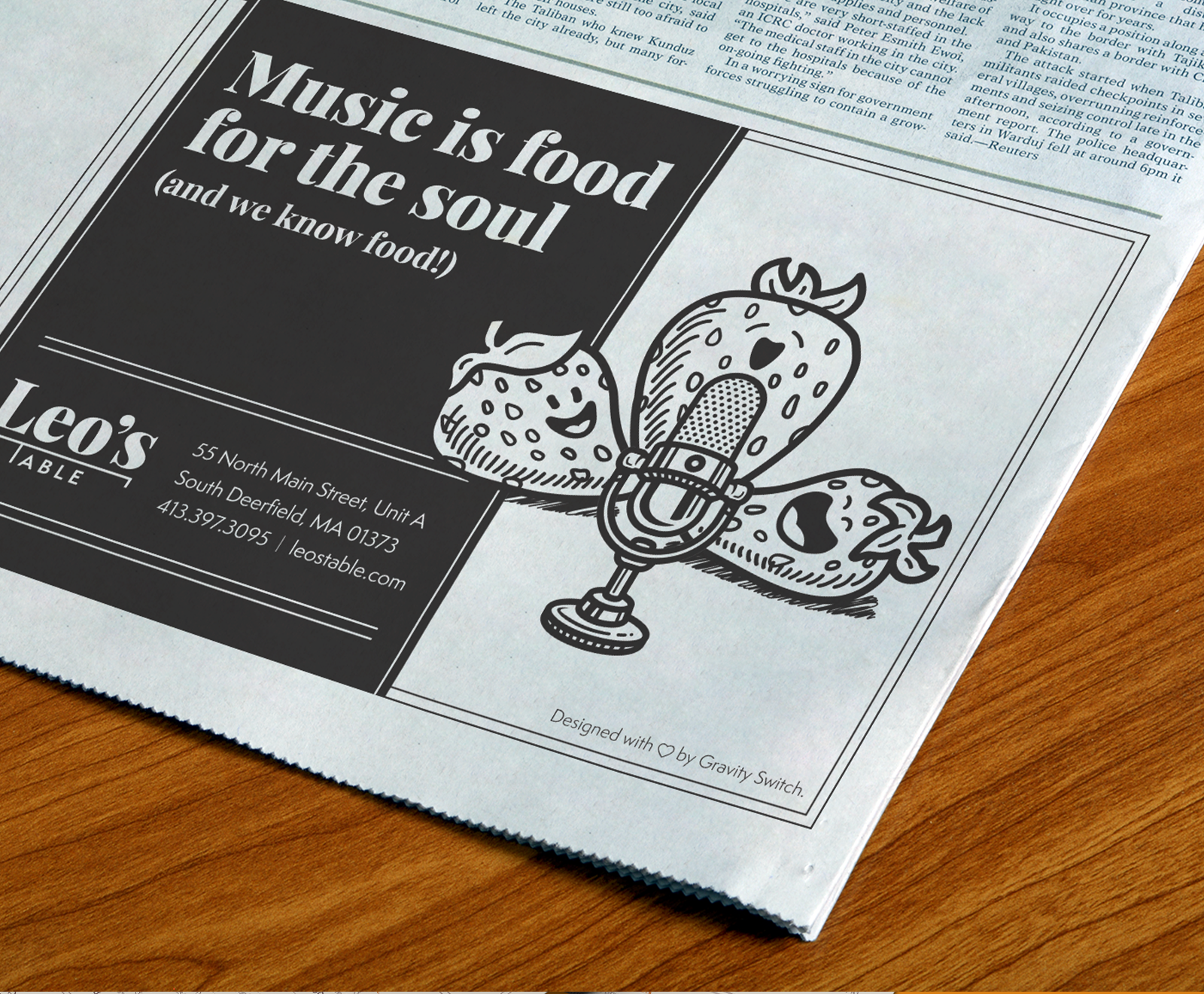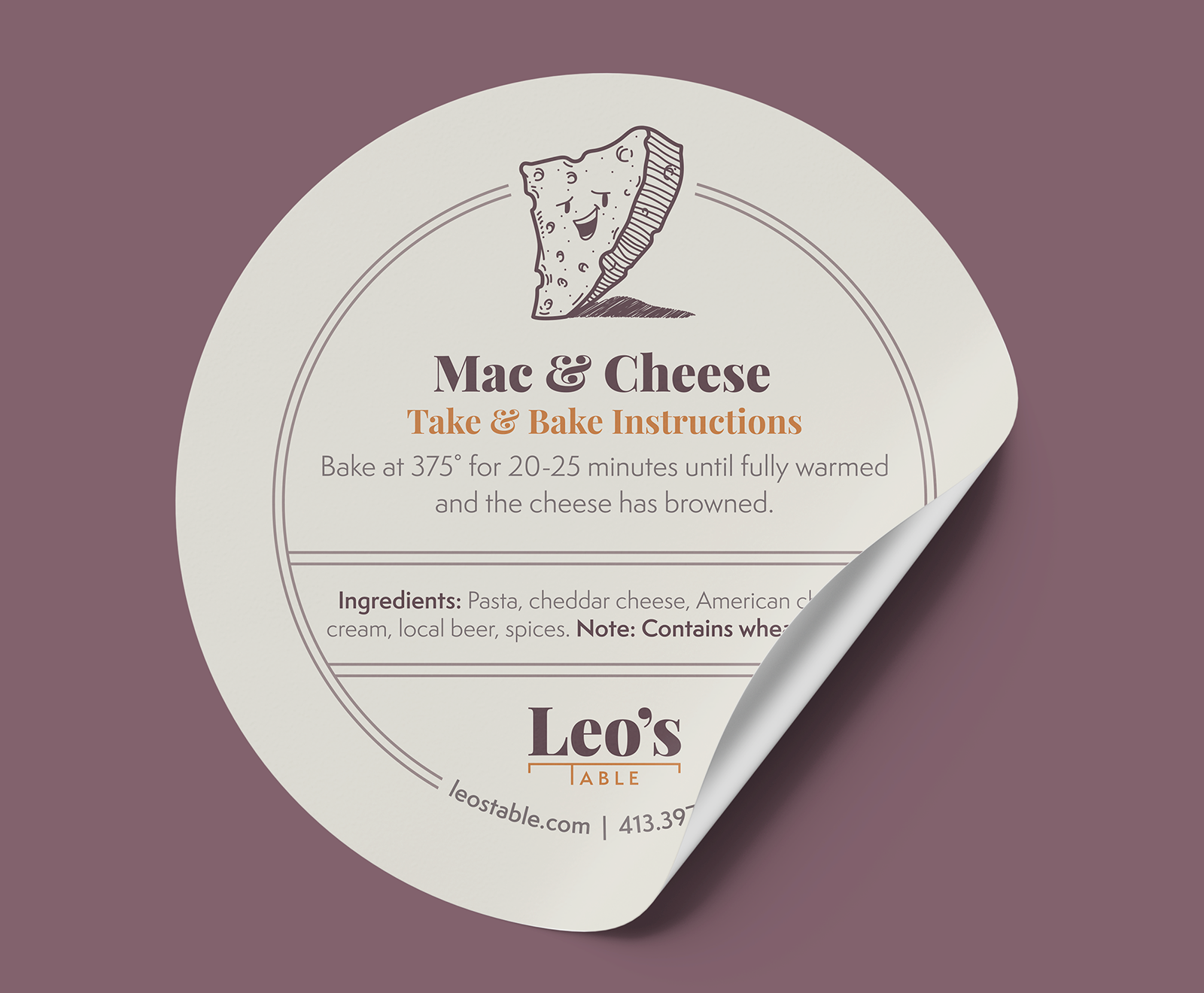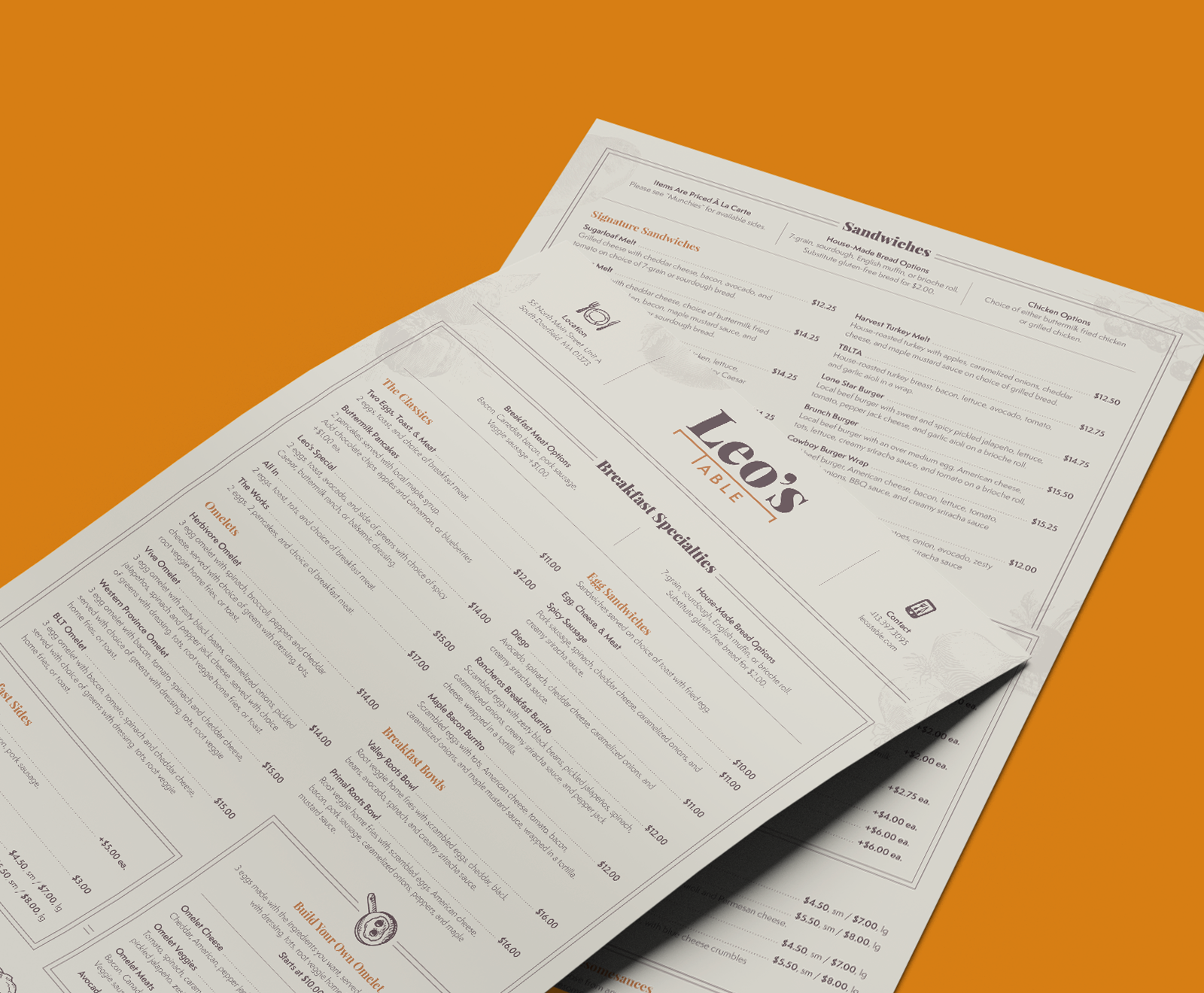 After creating a logo and color palette that leveraged the warmth of earth tones to imbue the brand with a vintage, farm table feeling, I illustrated a number of “food friends” that have been used on signage, cups and glasses, table number cards, t-shirts, and an award-winning menu (to name a few). There's no shortage of varied products I've designed for Leo's Table over the years, including menus, COVID-19 signage, several direct marketing mailers, packaging labels for products, and coupons.