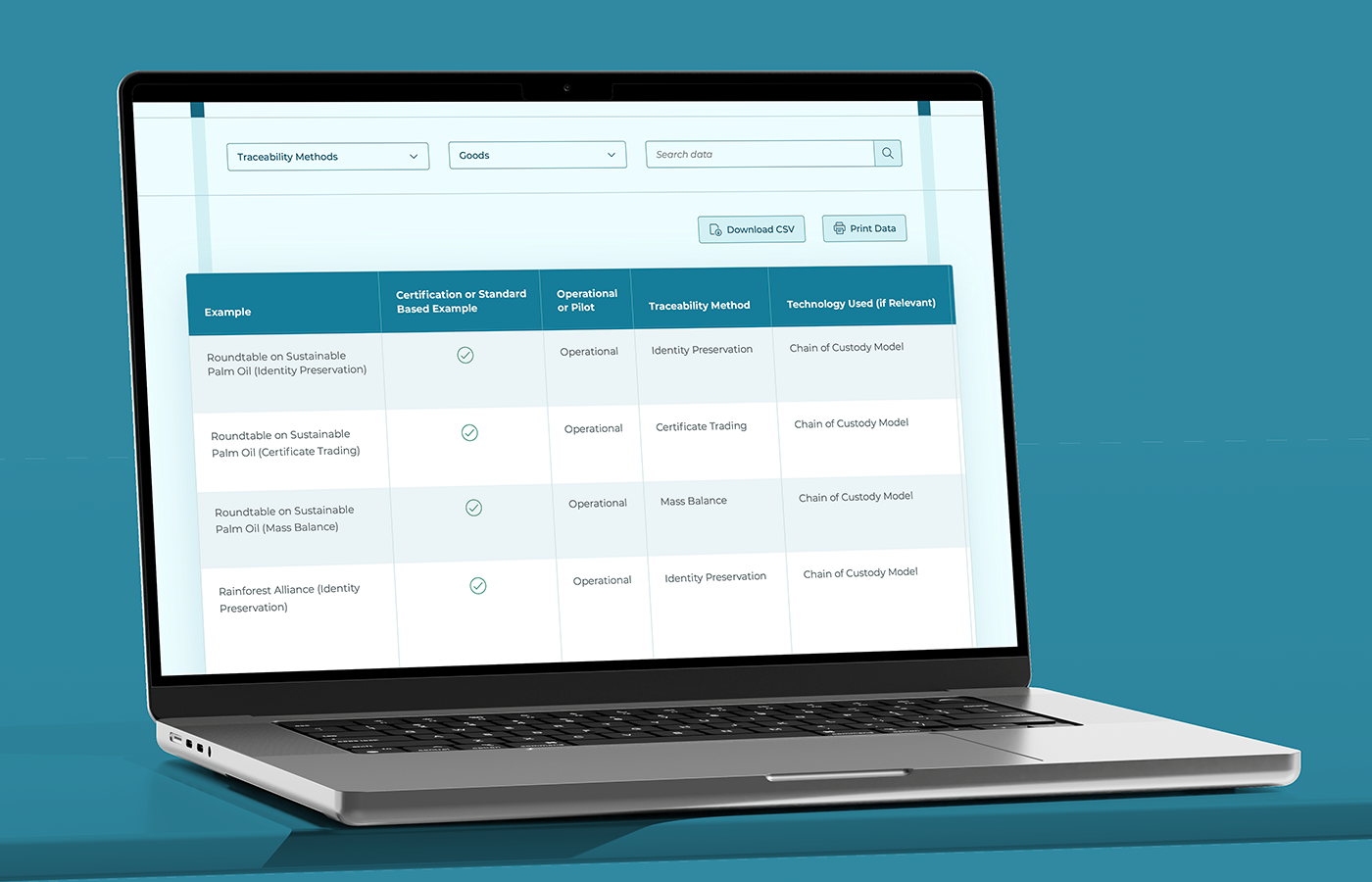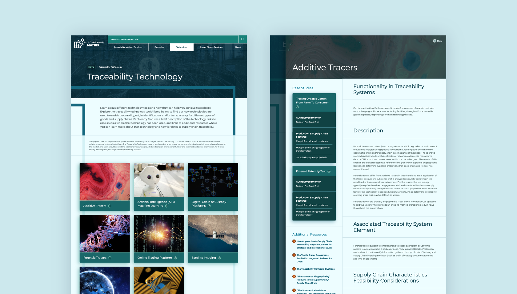 Traceability Technology list on desktop (left); profiled technology modal from the list on desktop (right);