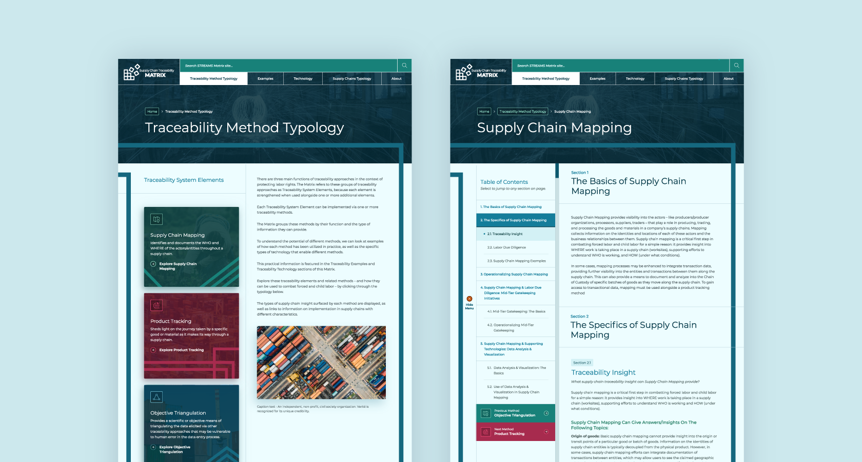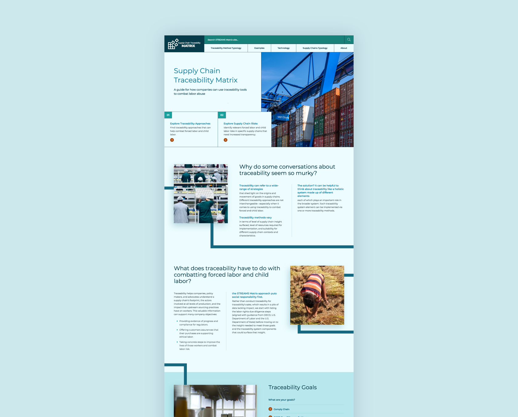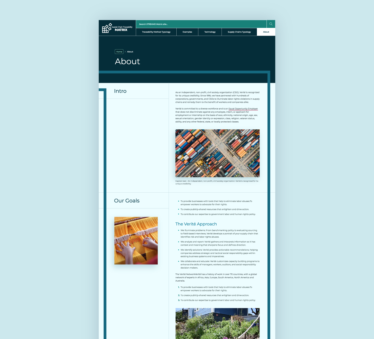 Committed to ensuring safe, fair, and legal working conditions for individuals worldwide, Verité began, and continues to lead, an initiative called the Supply Chain Tracing and Engagement Methodologies (STREAMS) Project. As part of that initiative, The Verité Supply Chain Traceability Matrix was created to help governments and civil society advocates design feasible traceability systems that can provide the information needed to support human and labor rights efforts in the context of diverse global supply chains. The website needed to serve two purposes: