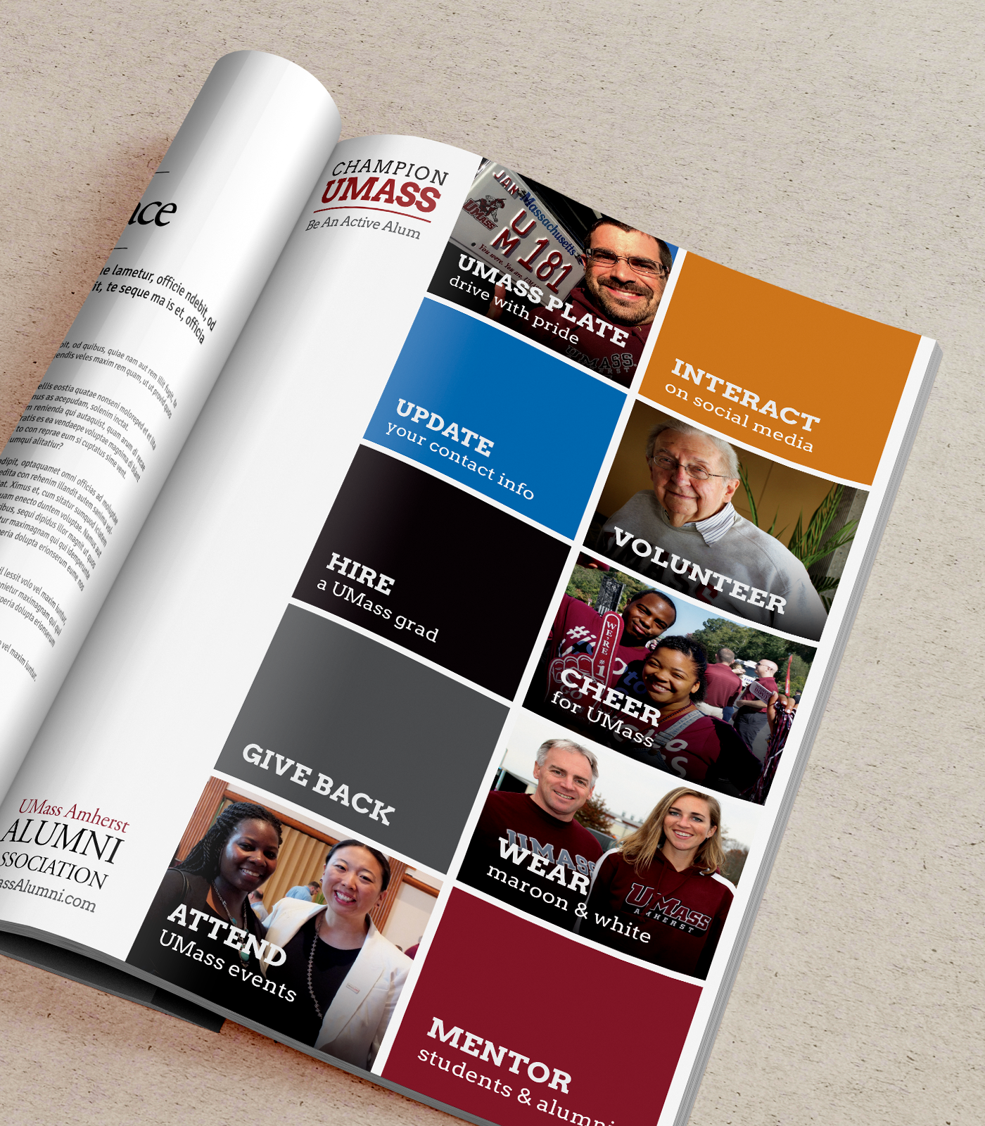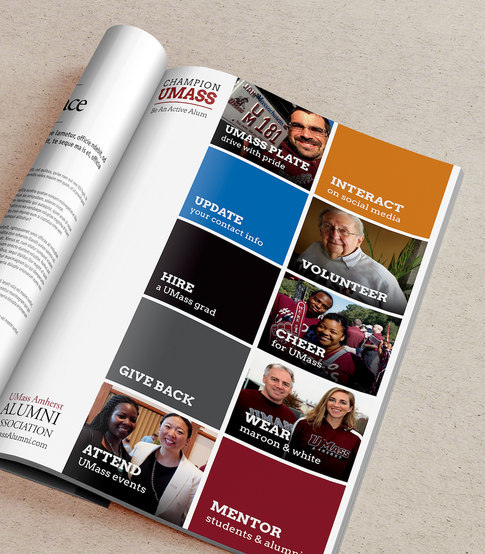 The UMass Amherst Alumni Association first came to Gravity Switch for help creating a bold and engaging look for their website. I joined the Gravity Switch team after the site had been successfully launched. So, when they returned for help applying this new visual voice to their print and digital channels, it was up to me to establish a unified brand identity for a wide range of materials.